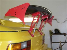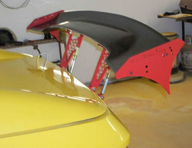 This is the STRONGEST,  most adjustable Rear Spoiler on the market today. Both adjuster ends are steel, we use large 3/8 inch Steel Adjuster Ends (not the little 1/4 inch cast aluminum eye ends that have failed in the past).  Also our own custom Steel Turnbuckle Clevis allows for both quick and easy fore and aft movement, height and pedestal angle adjustments. Using this design our spoiler can be set up to be adjusted completely by hand instantly without the use of tools if required. Or it can be configured to being adjusted using normal hand tools.